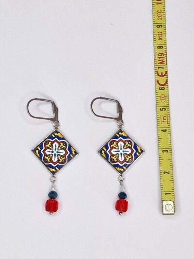 Boucles d’oreilles dormeuses en acier inoxydable dorées. Motifs inspirés des carreaux de céramiques italienne. Ces boucles sont parfaites pour accompagner une tenue unie. Perles de cristal. Motifs colorés, parfait pour donner un peu de couleur à une tenue unie.