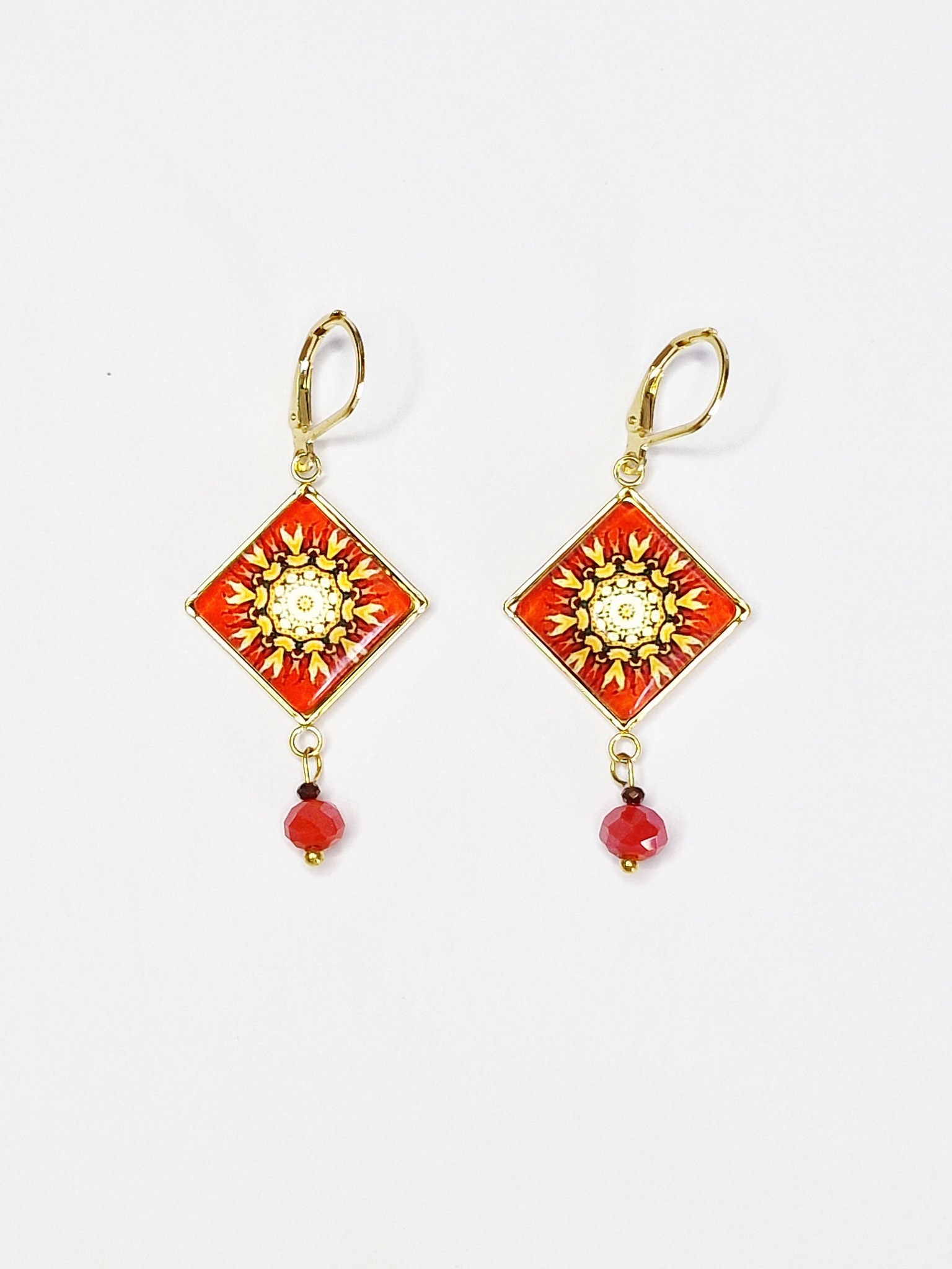 Boucles d'oreilles dormeuses en acier inoxydable dorées. Motifs inspirés des carreaux de céramiques italienne. Ces boucles sont parfaites pour accompagner une tenue unie. Perles de cristal. Motifs colorés, parfait pour donner un peu de couleur à une tenue unie. Rouge.