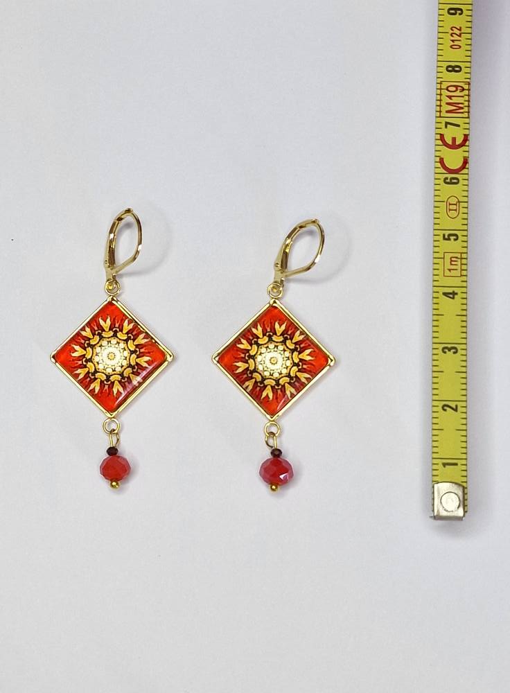 Boucles d’oreilles dormeuses en acier inoxydable dorées. Motifs inspirés des carreaux de céramiques italienne. Ces boucles sont parfaites pour accompagner une tenue unie. Perles de cristal. Motifs colorés, parfait pour donner un peu de couleur à une tenue unie. Rouge.