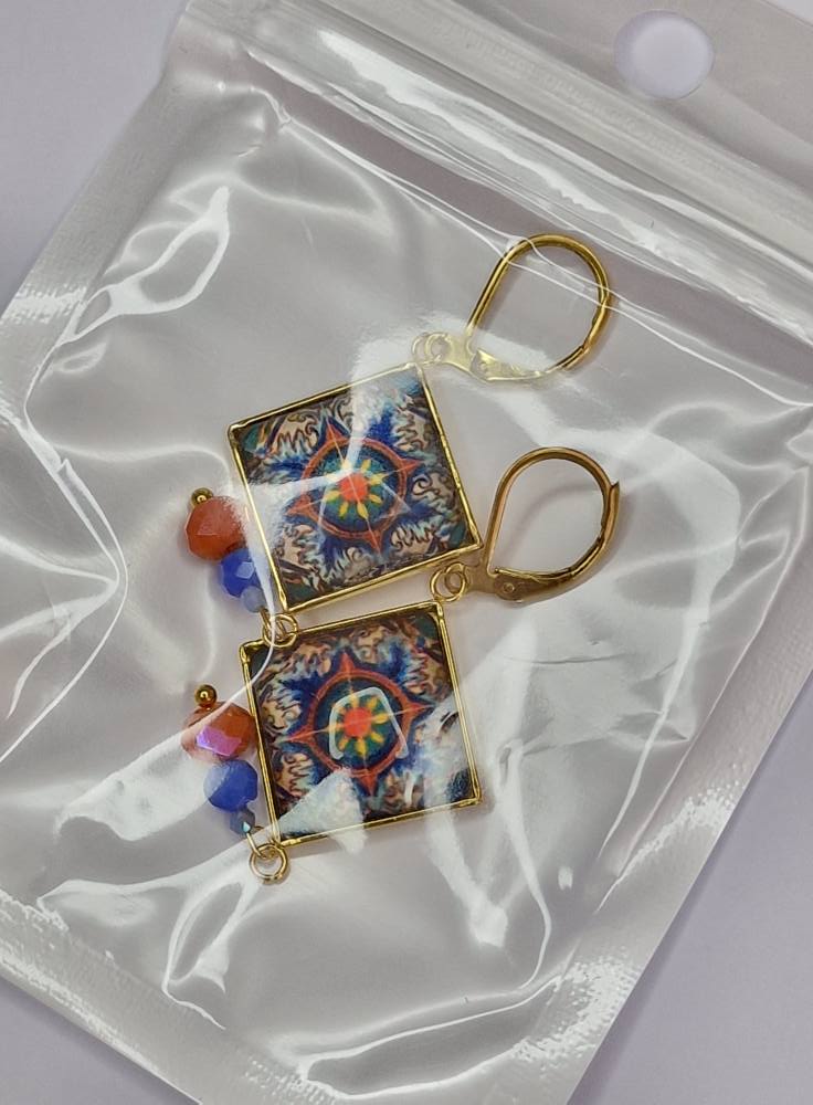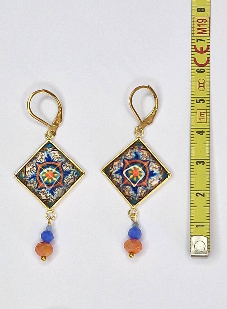 Boucles d'oreilles dormeuses en acier inoxydable dorées. Motifs inspirés des carreaux de céramiques italienne. Ces boucles sont parfaites pour accompagner une tenue unie. Perles de cristal. Motifs colorés, parfait pour donner un peu de couleur à une tenue unie.