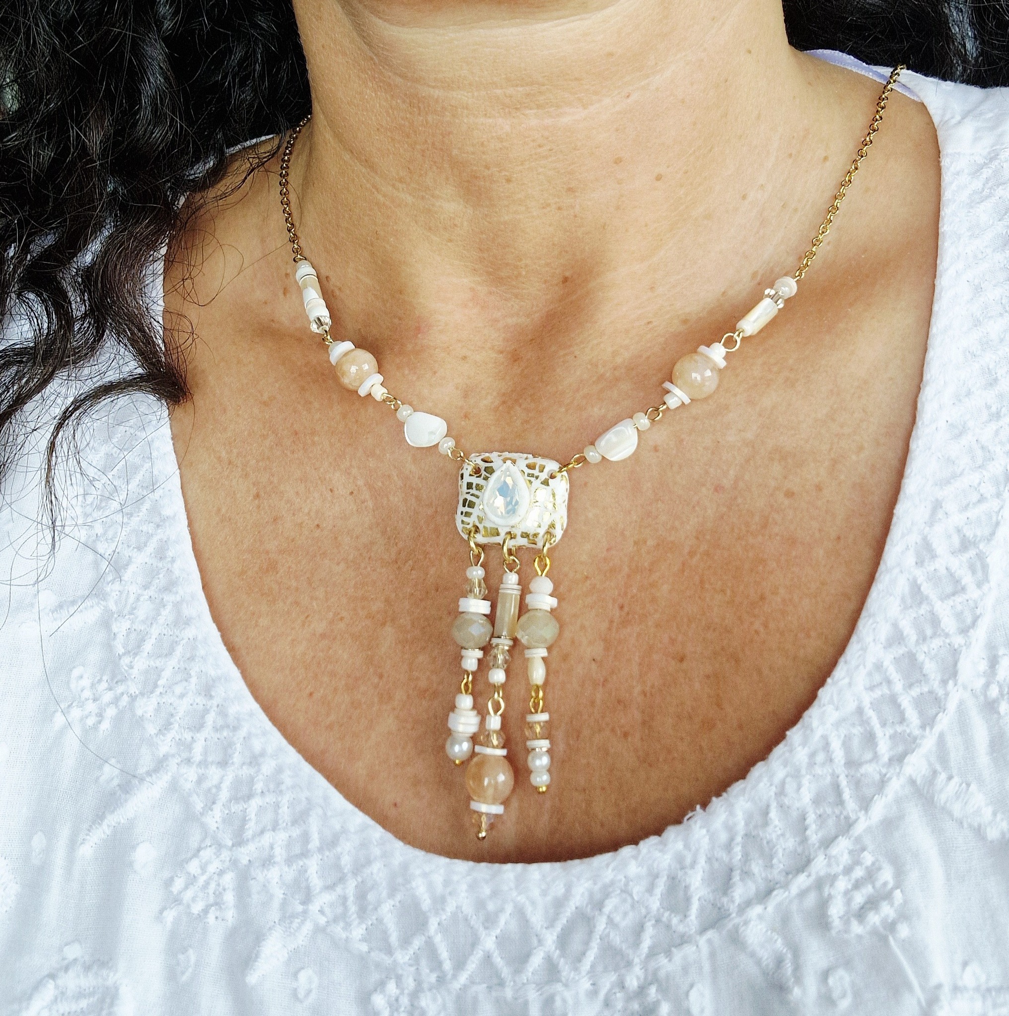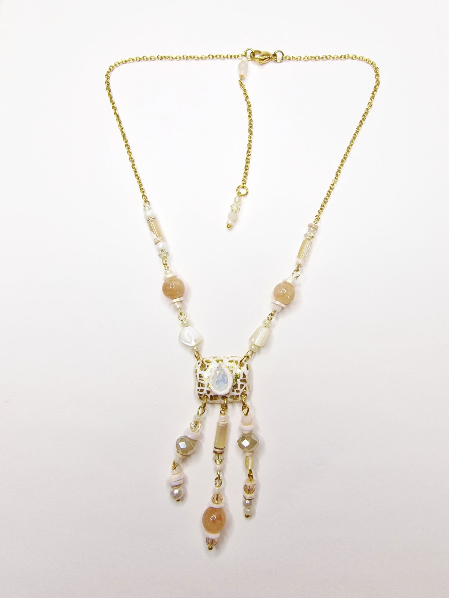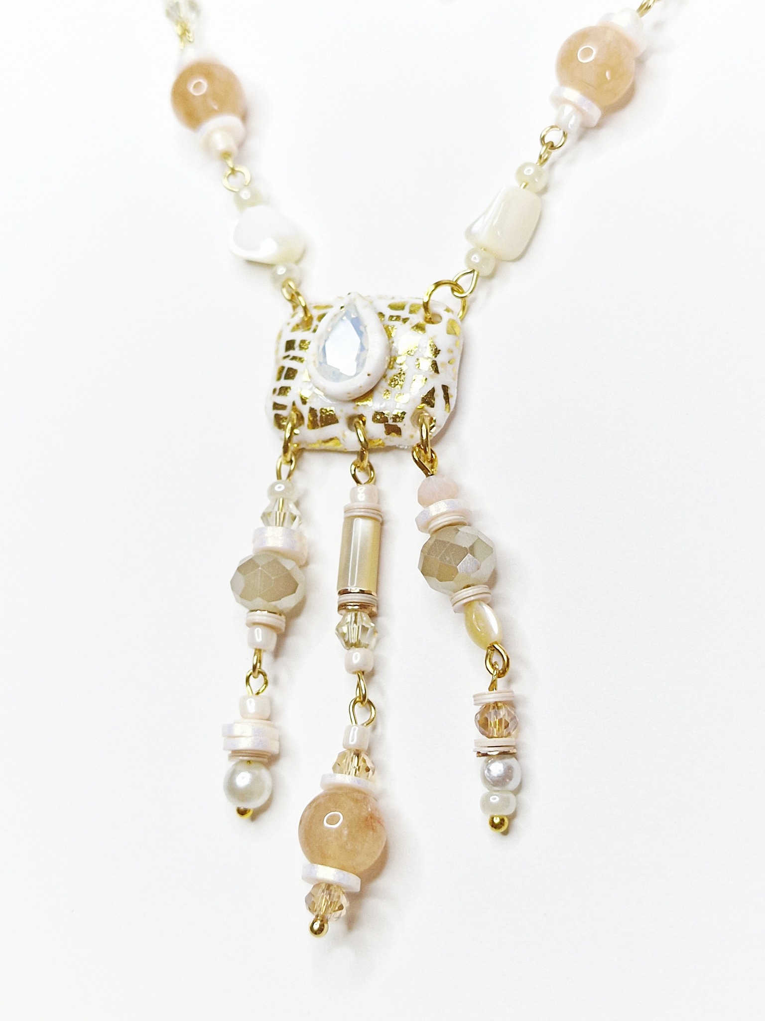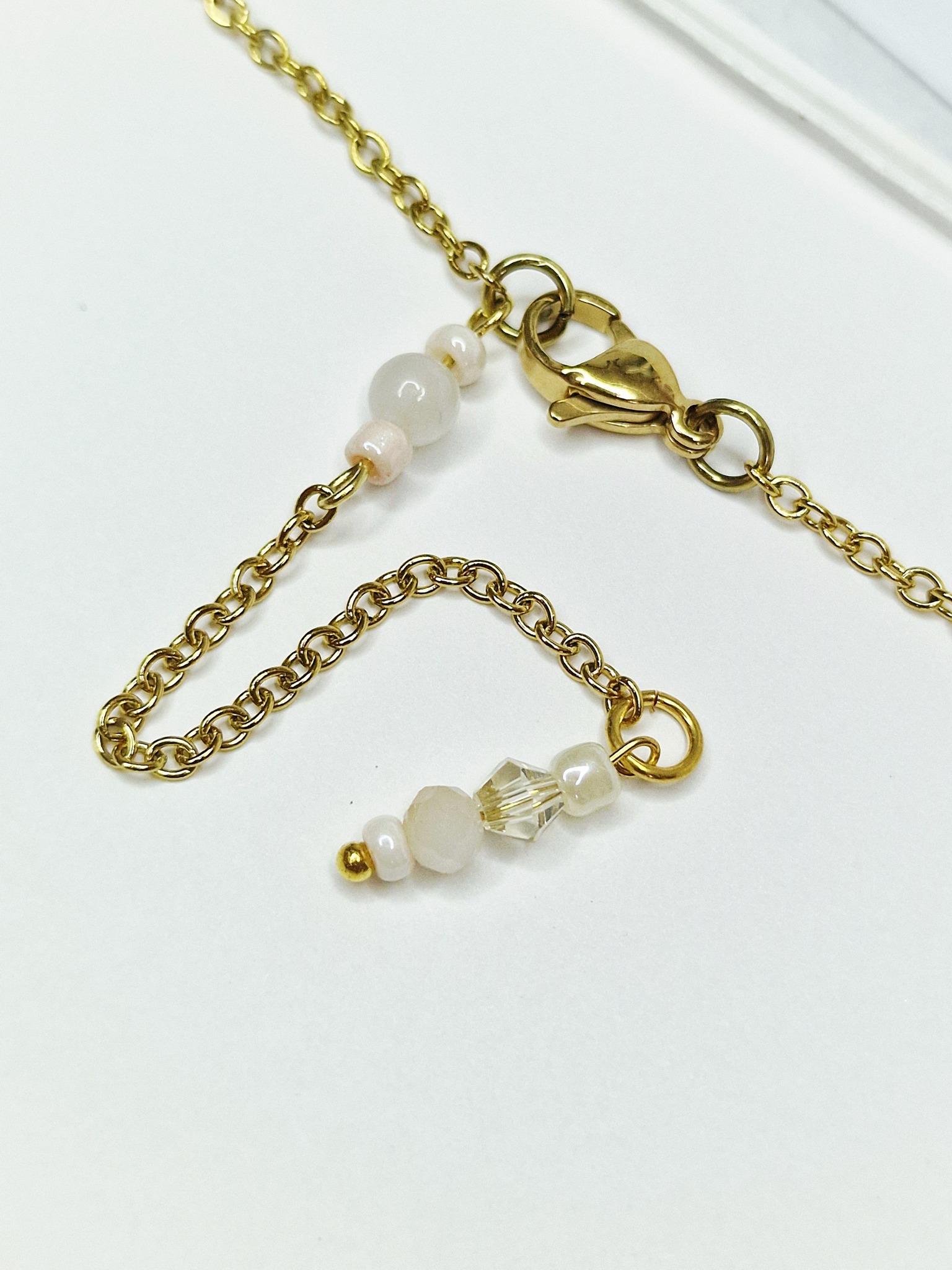 Collier court, chaîne et tiges en acier inoxydable. Perles de verre et cristal opaline et nacre. Pierre Morganite. Pendentif réalisé en résine mélangée à de la feuille d’or 24K, incrusté d’une opaline de cristal. collier ajustable.