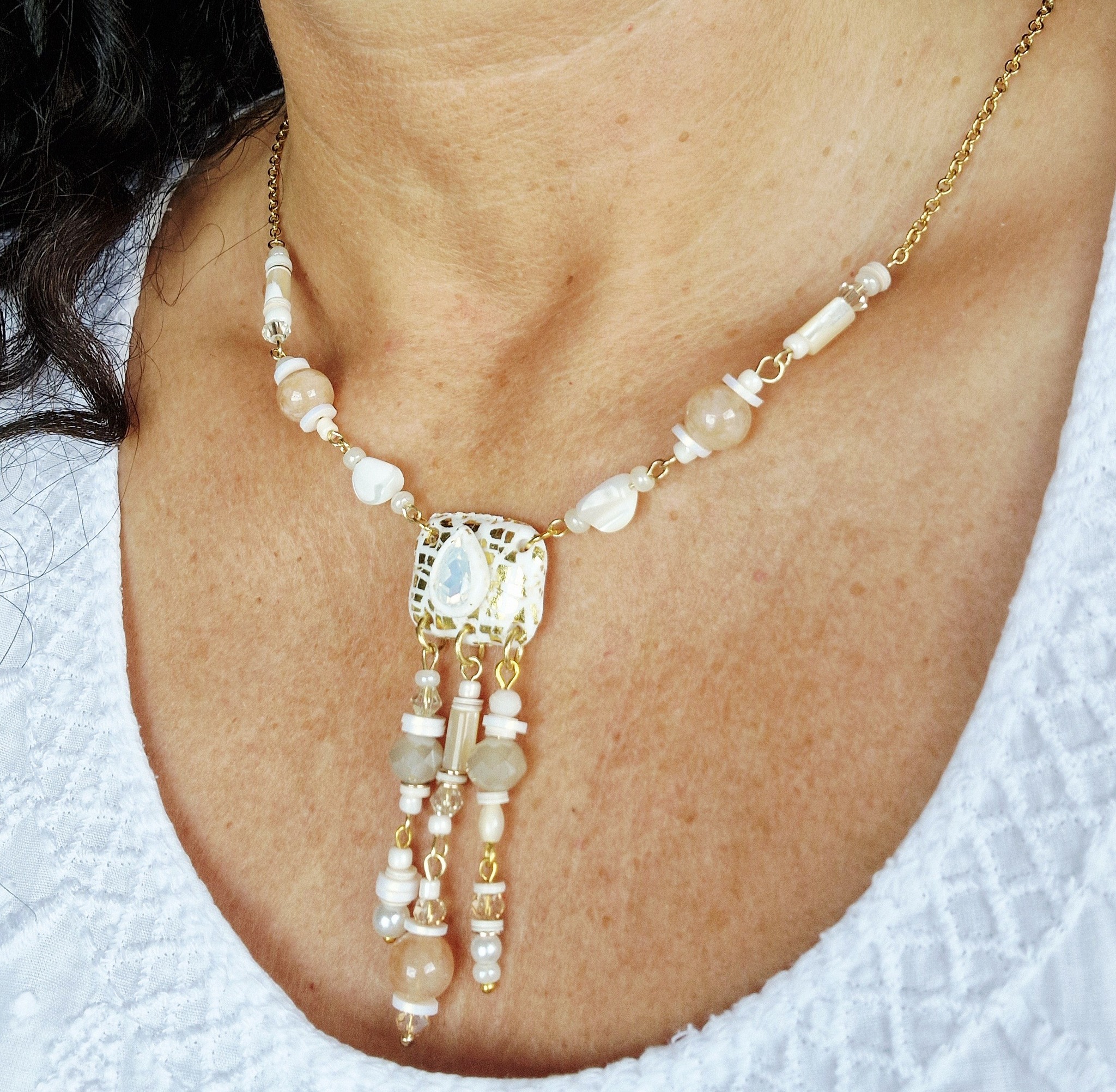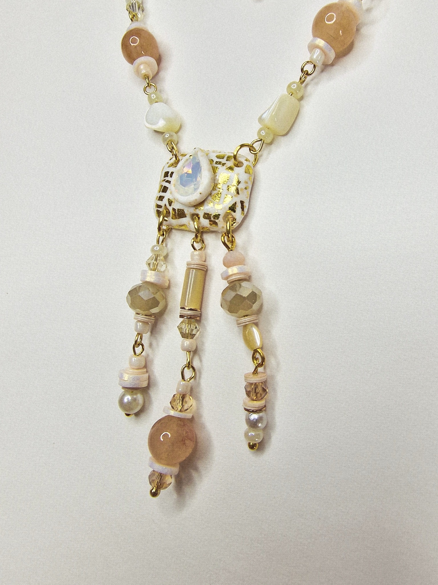 Collier court, chaîne et tiges en acier inoxydable. Perles de verre et cristal opaline et nacre. Pierre Morganite. Pendentif réalisé en résine mélangée à de la feuille d'or 24K, incrusté d'une opaline de cristal. Collier ajustable.