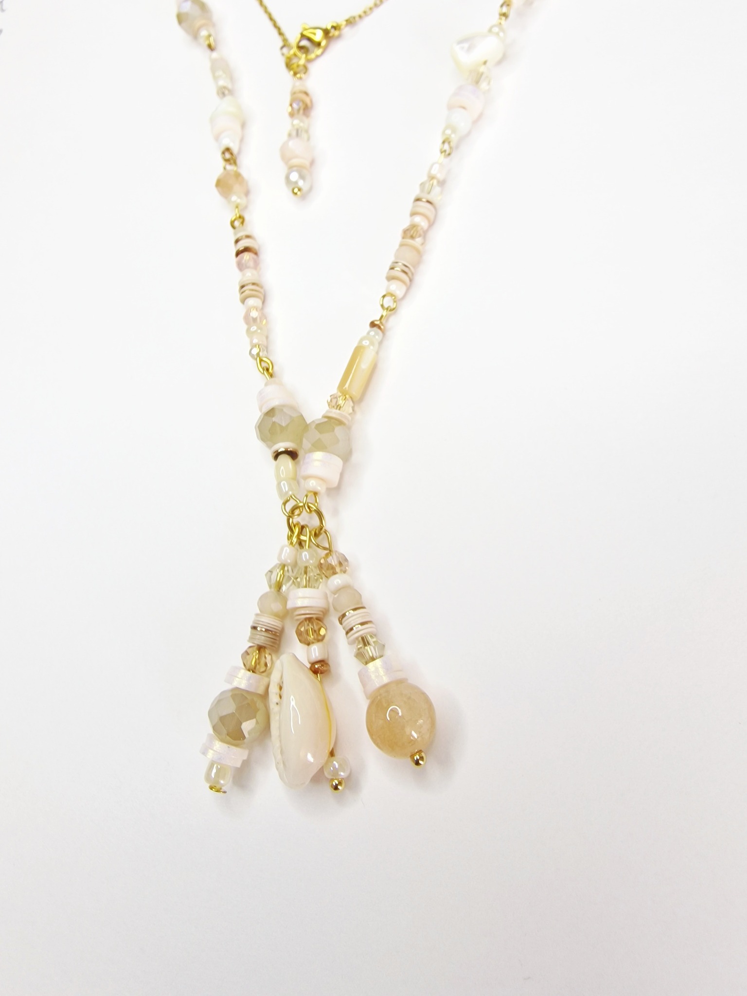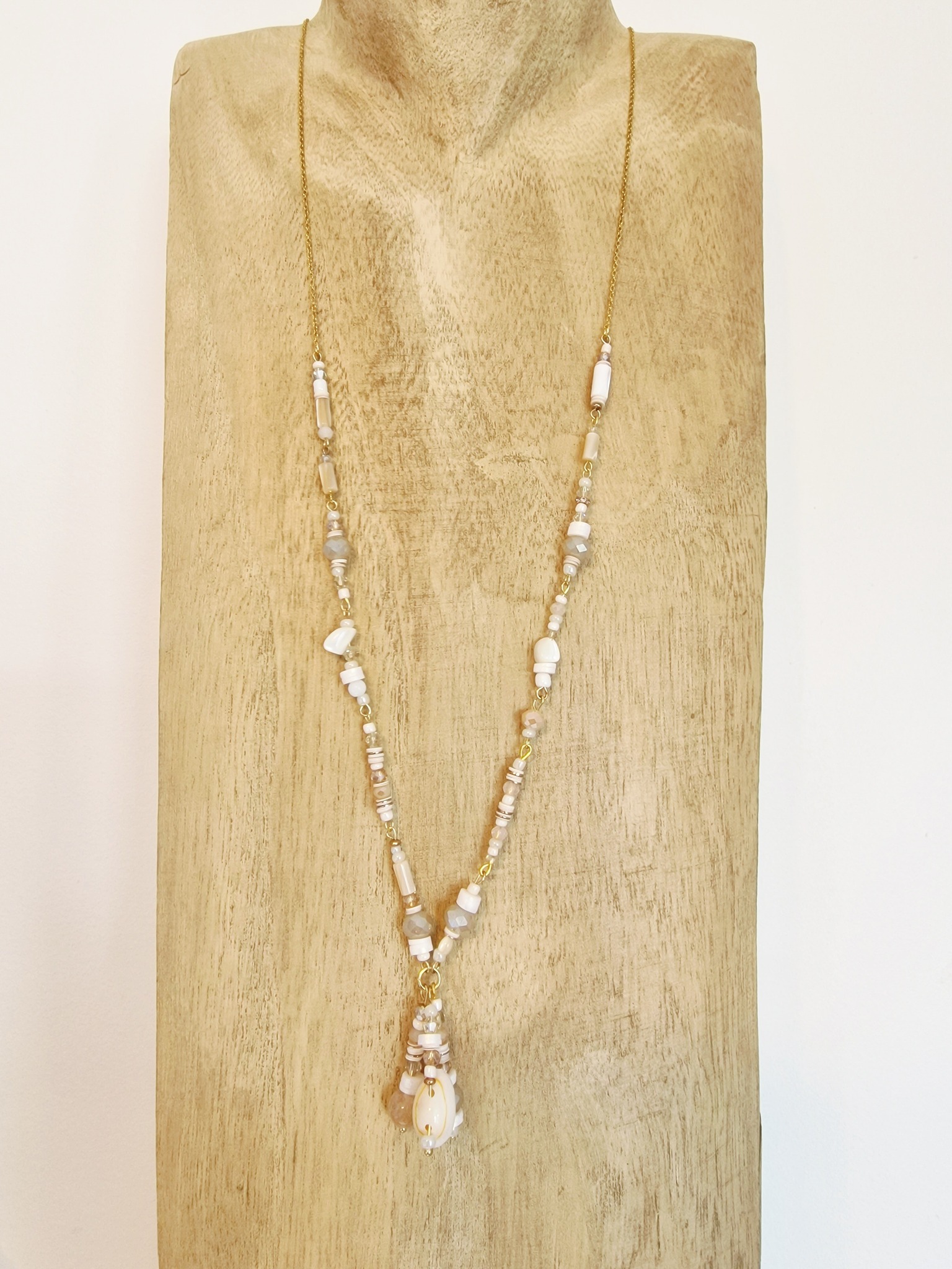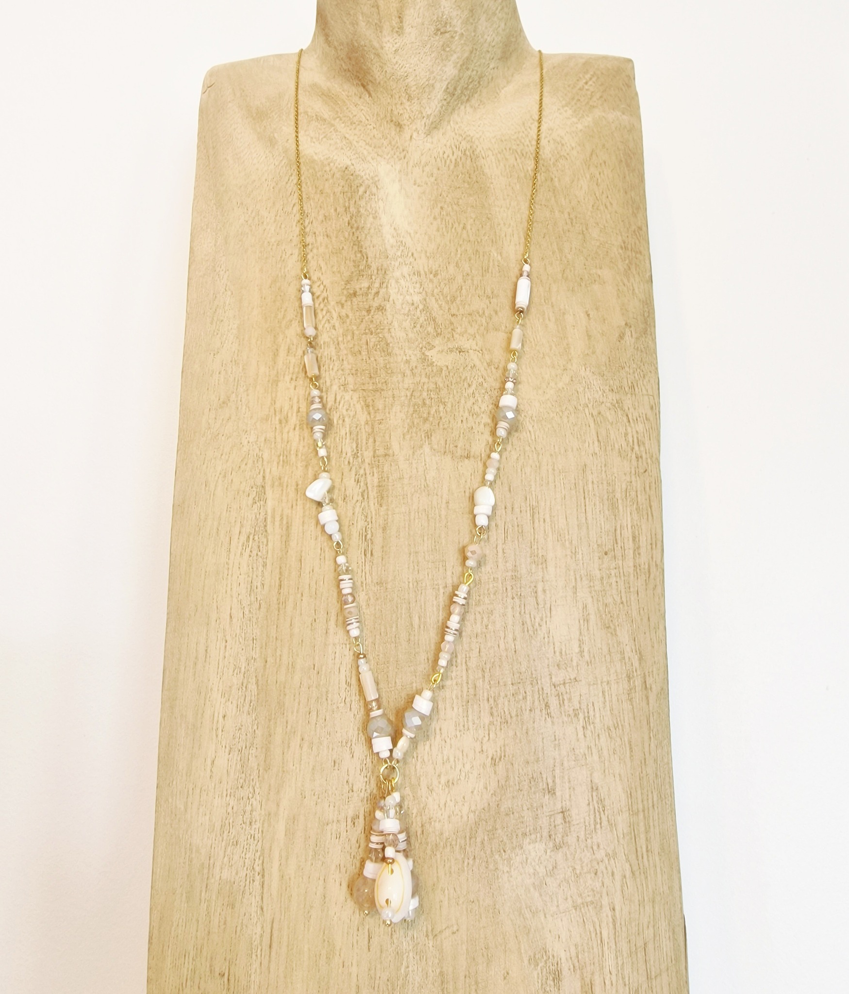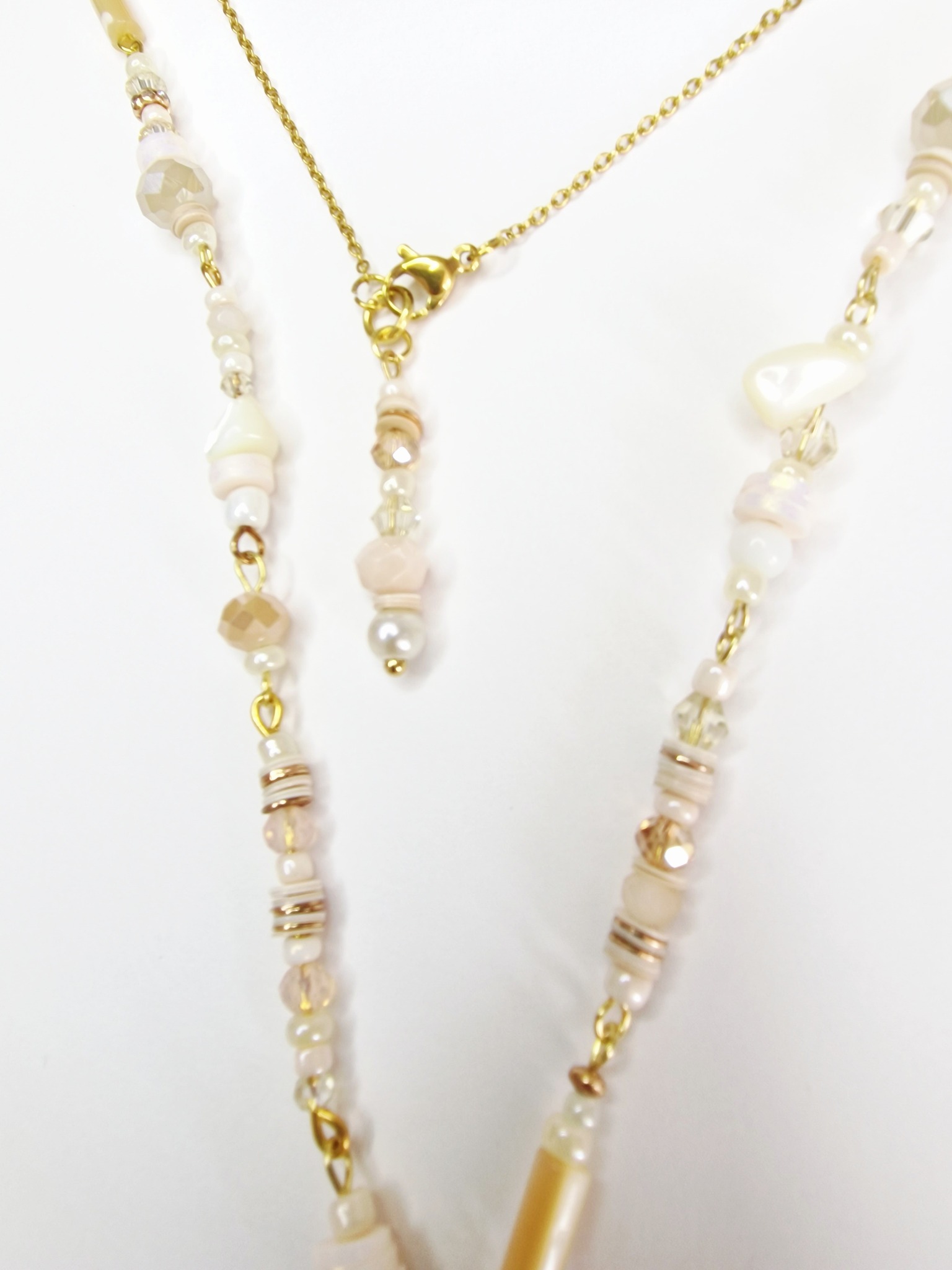 Collier long, chaîne et tiges en acier inoxydable. Perles de verre et cristal opaline. Coquillage et nacre. Pierre Morganite.