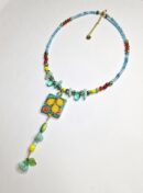 Collier réalisé en perles de verre et de cristal. Perle centrale en céramique motifs citrons. Collier court ajustable. Turquoise et jaune citron. inspiré des céramiques siciliennes. Ce bijou évoque un été à Sorento. Collier ajustable.