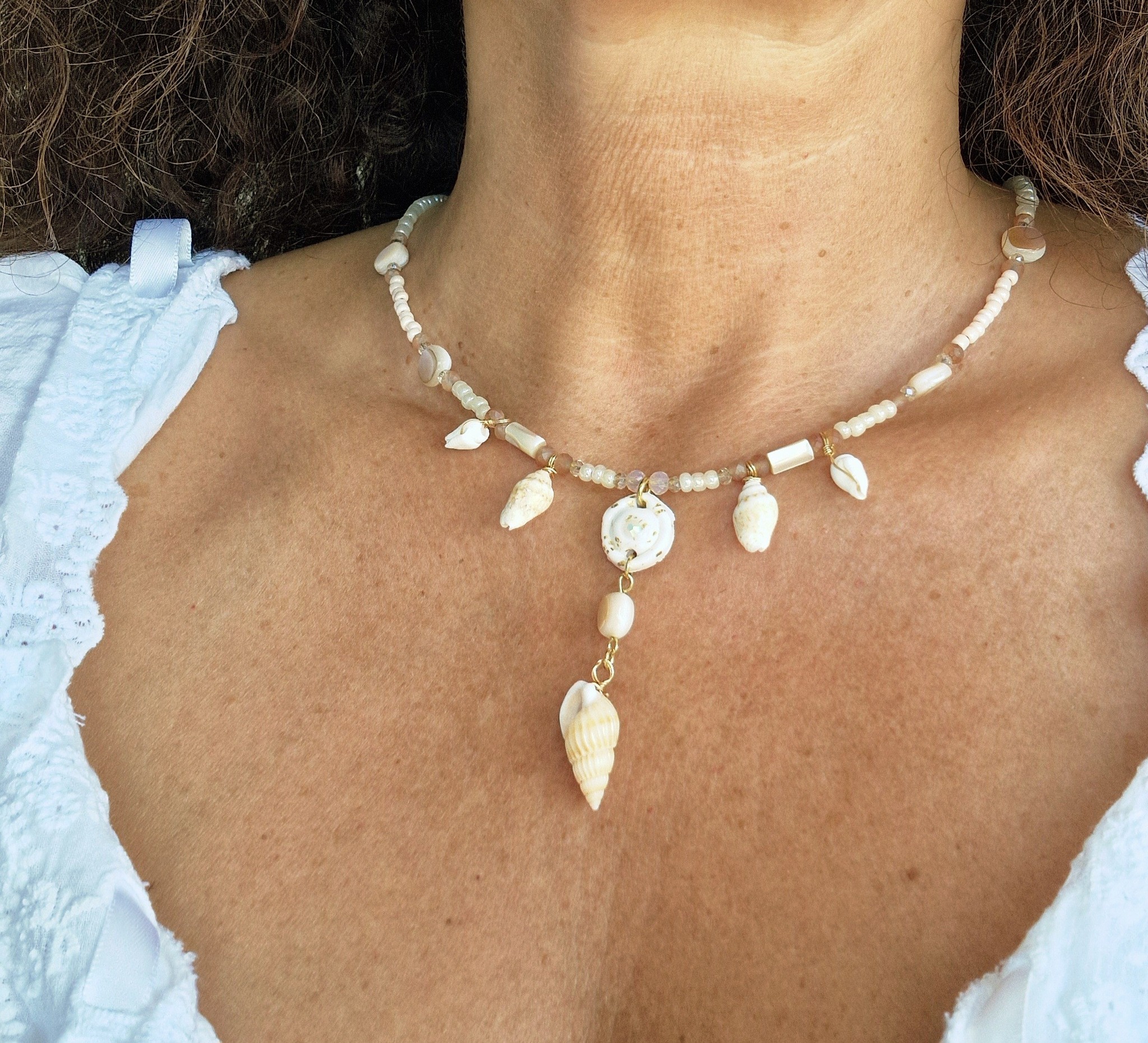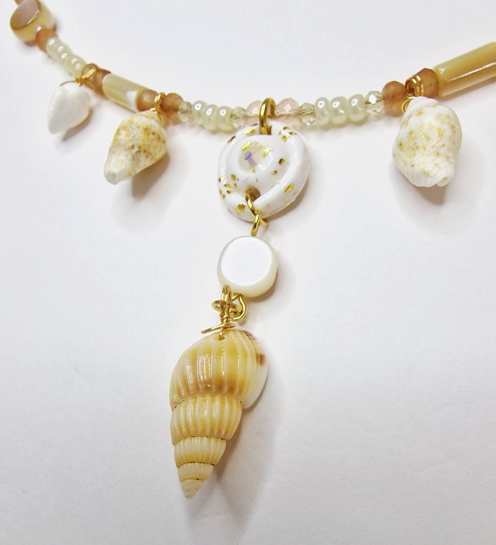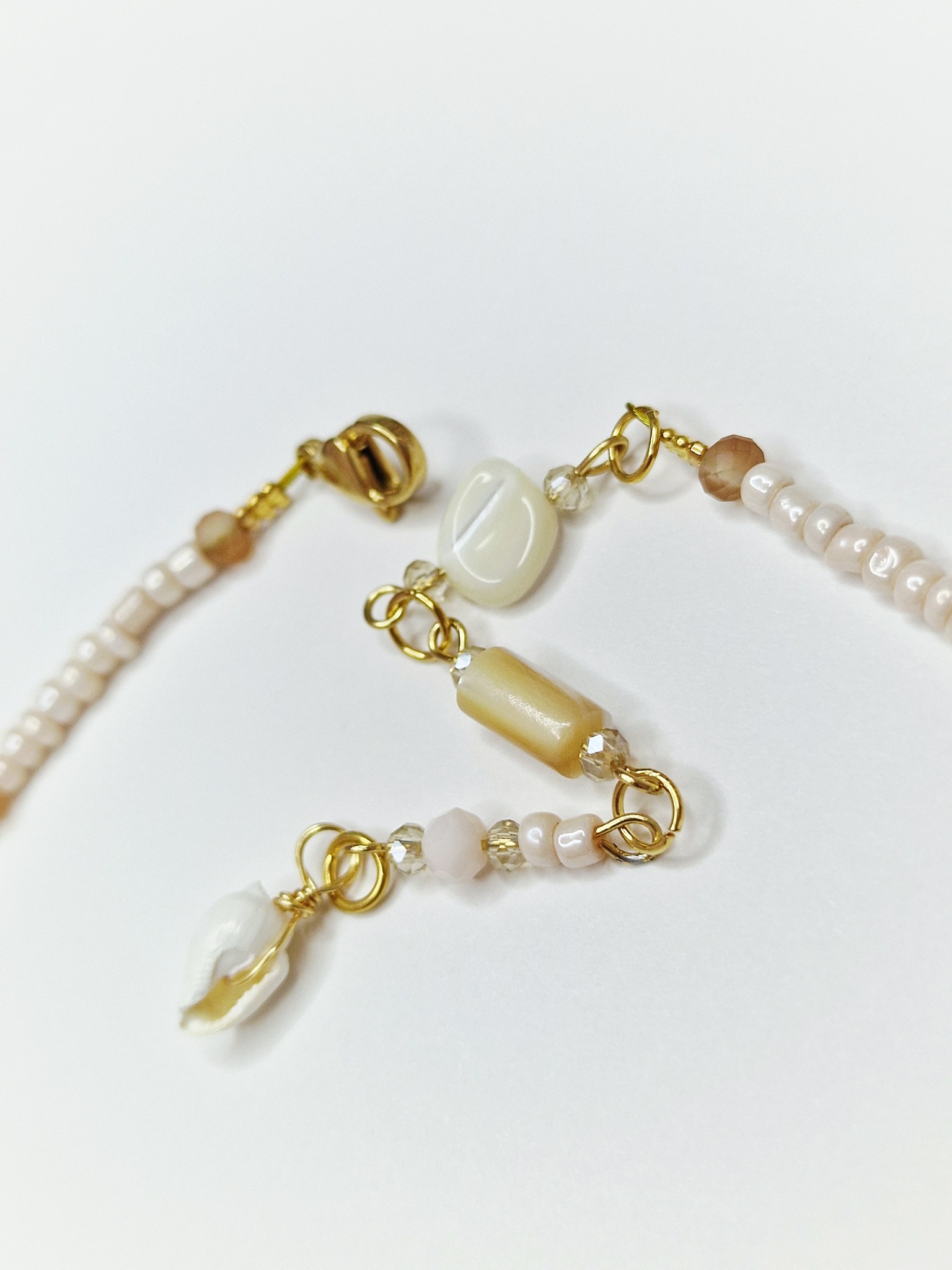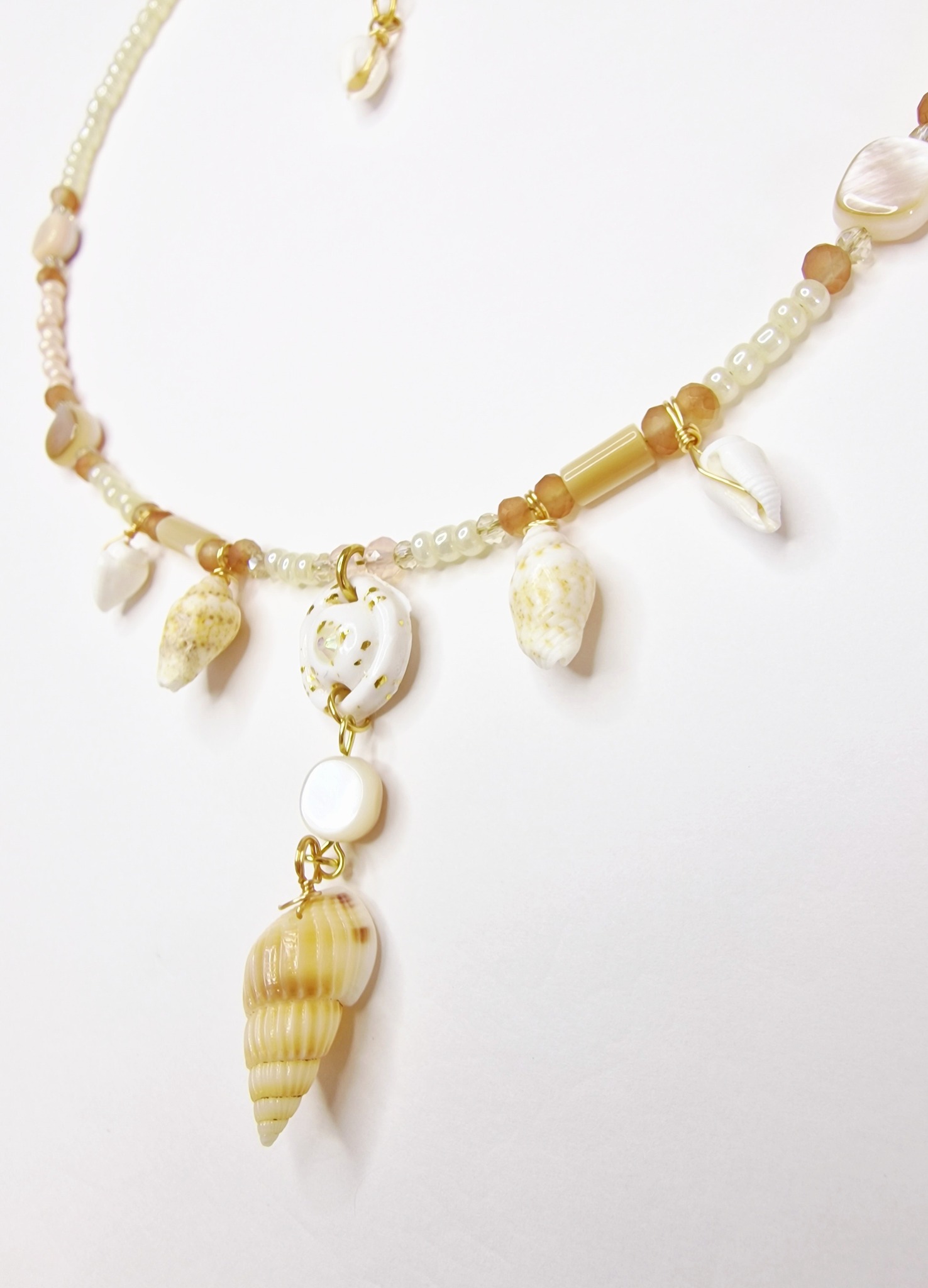 Collier court ajustable. Perles de rocailles, perles de nacre et coquillages. Pendentif central réalisé en résine blanche mélangée à de la feuilles d'or 24K. teintes: blanc et sable. Série limitée.