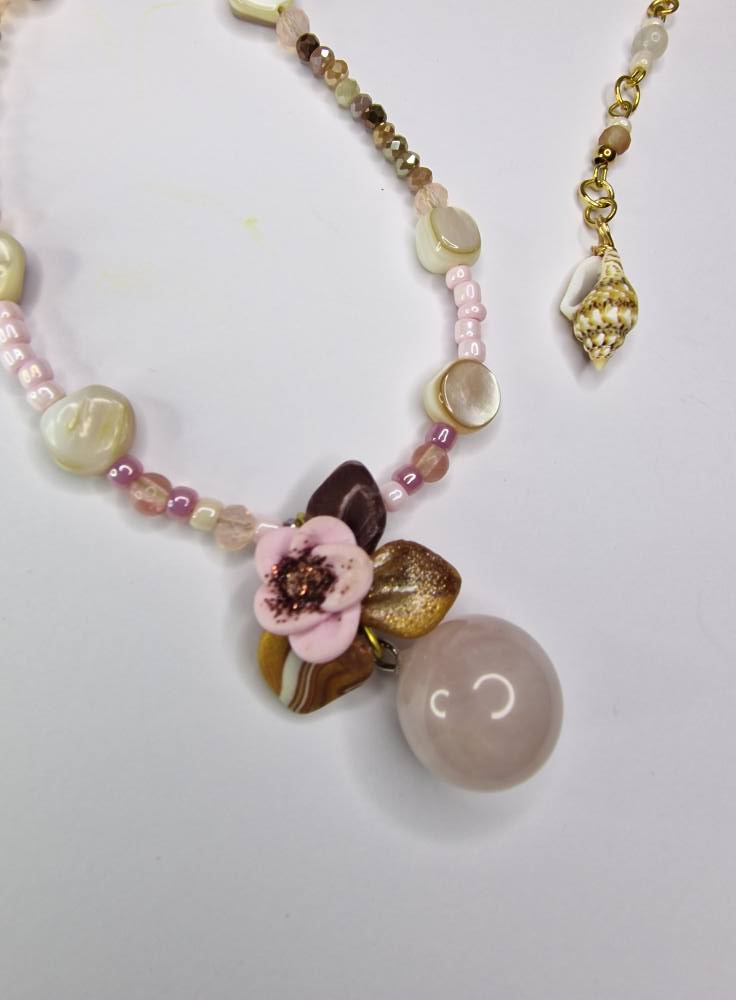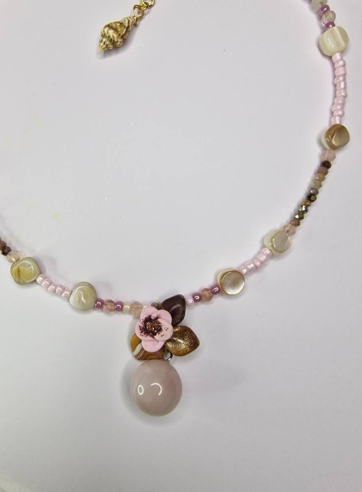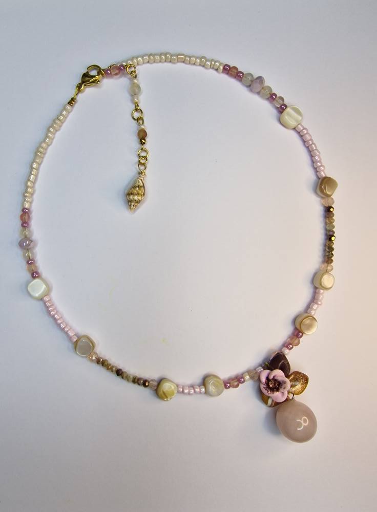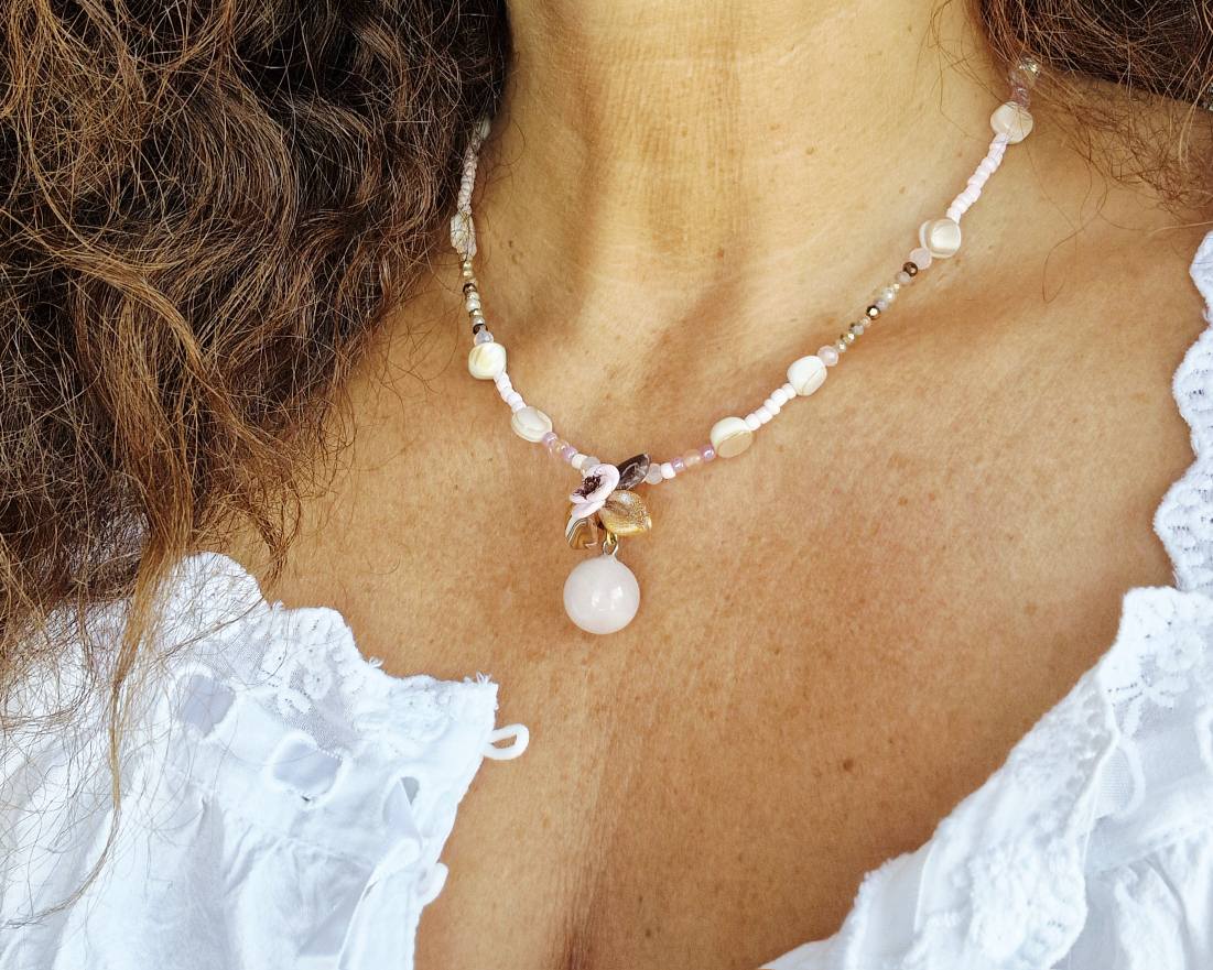 Un collier délicat qui sent la fin de l’été. Les coquillages se mêlent aux teintes d’automne et au rose poudré.