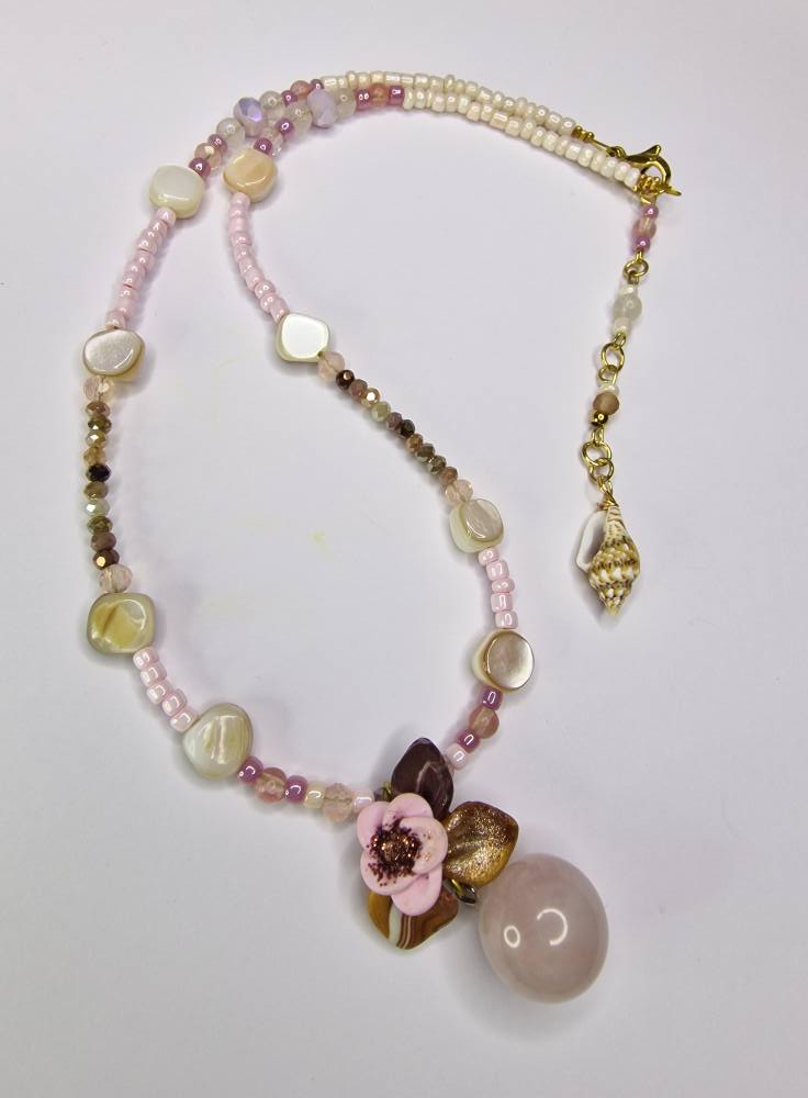 Collier perles de nacre, cristal. Perles fantaisies et pierres quartz rose. Motif fleur rose poudré.
