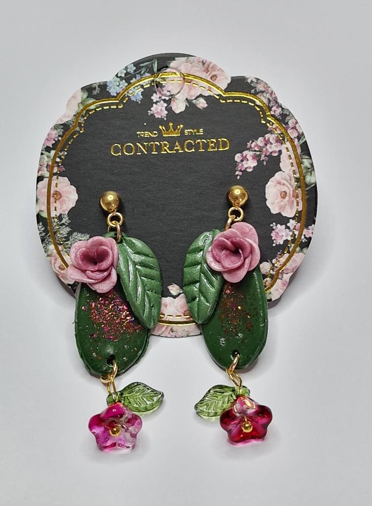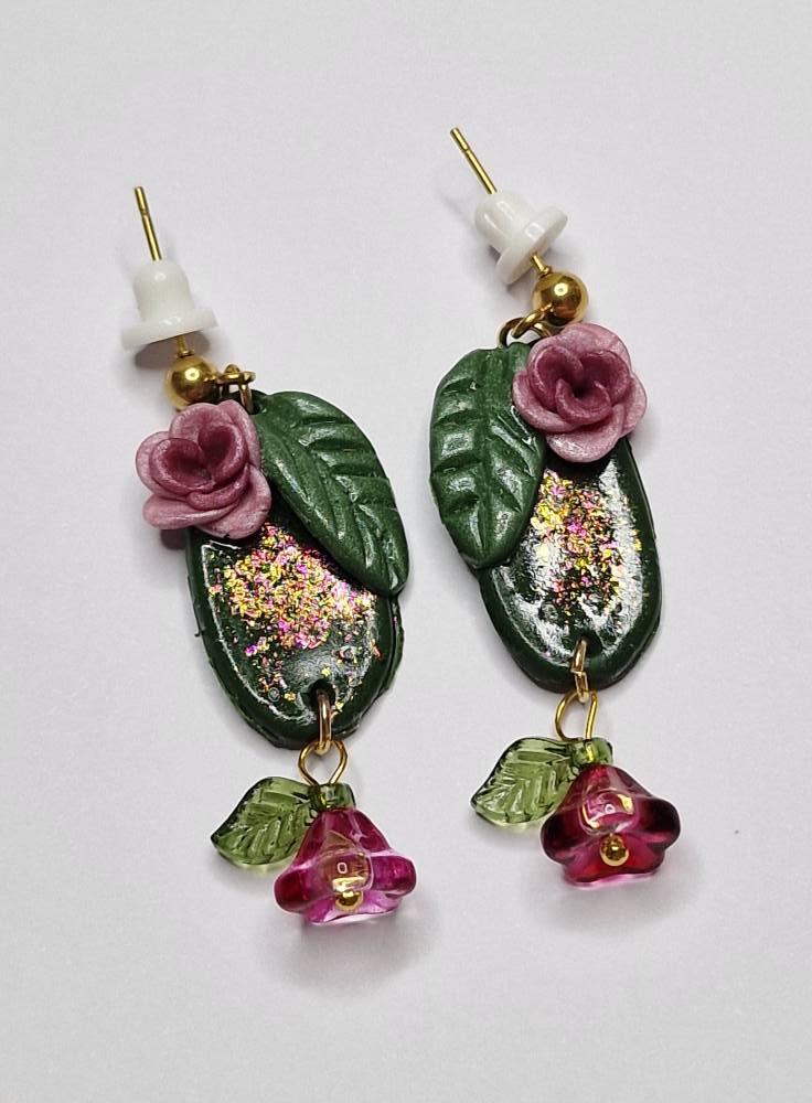 Boucles d’oreilles feuilles vertes et rose tendre – version clous (acier inoxydable & argile polymère)