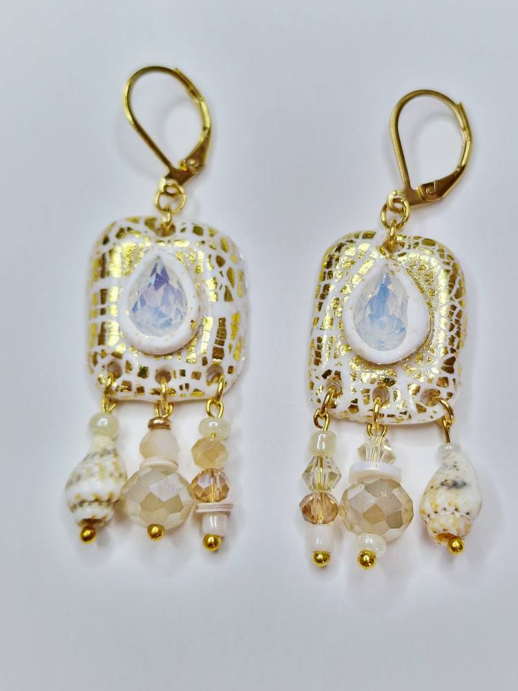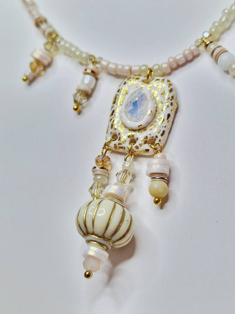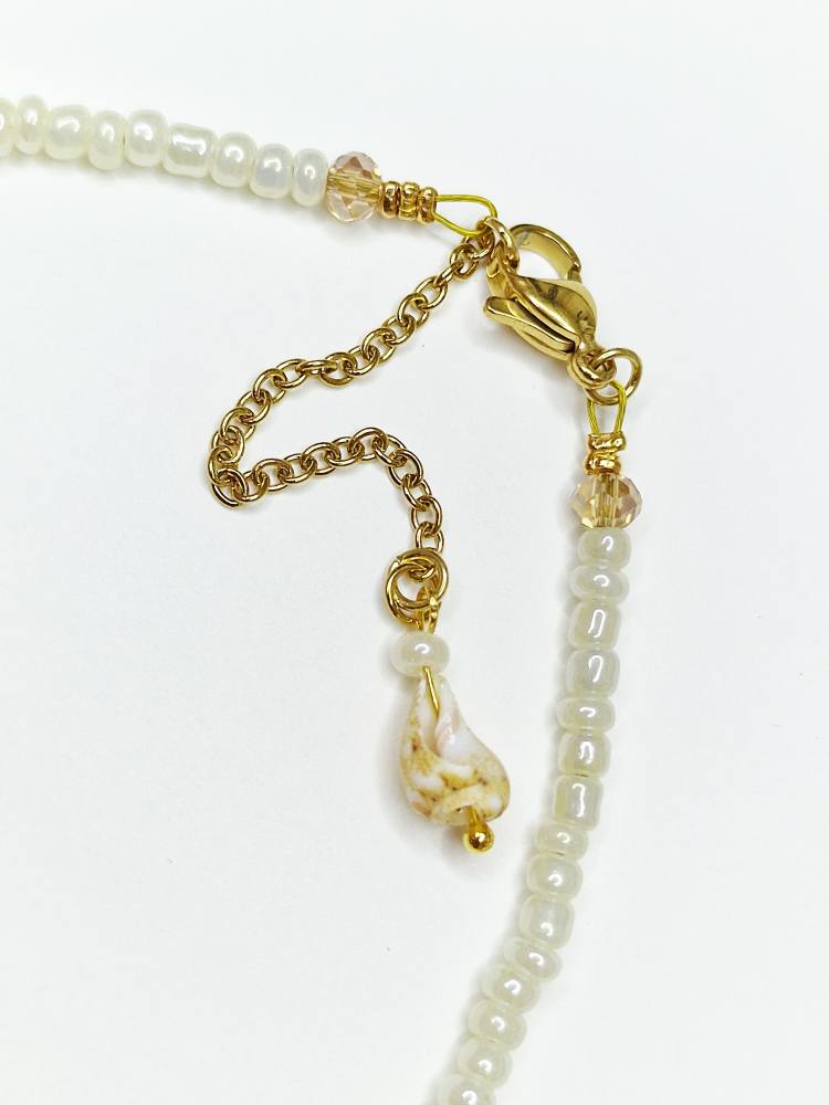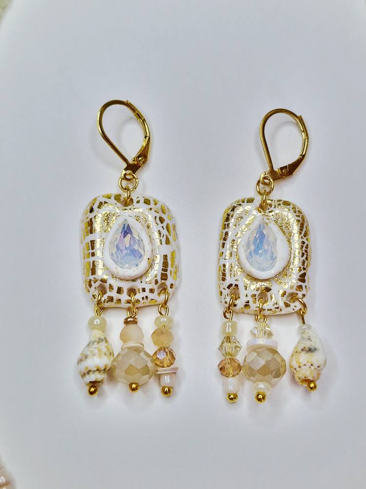 Collier unique et boucles d’oreilles. Perles de verre, de cristal. Résine mélangée à de la feuille d’or 24K incrustée d’un cabochon de cristal blanc transparent. collier court ajustable avec chaîne en acier inoxydable doré. Blanc et sable et or.
