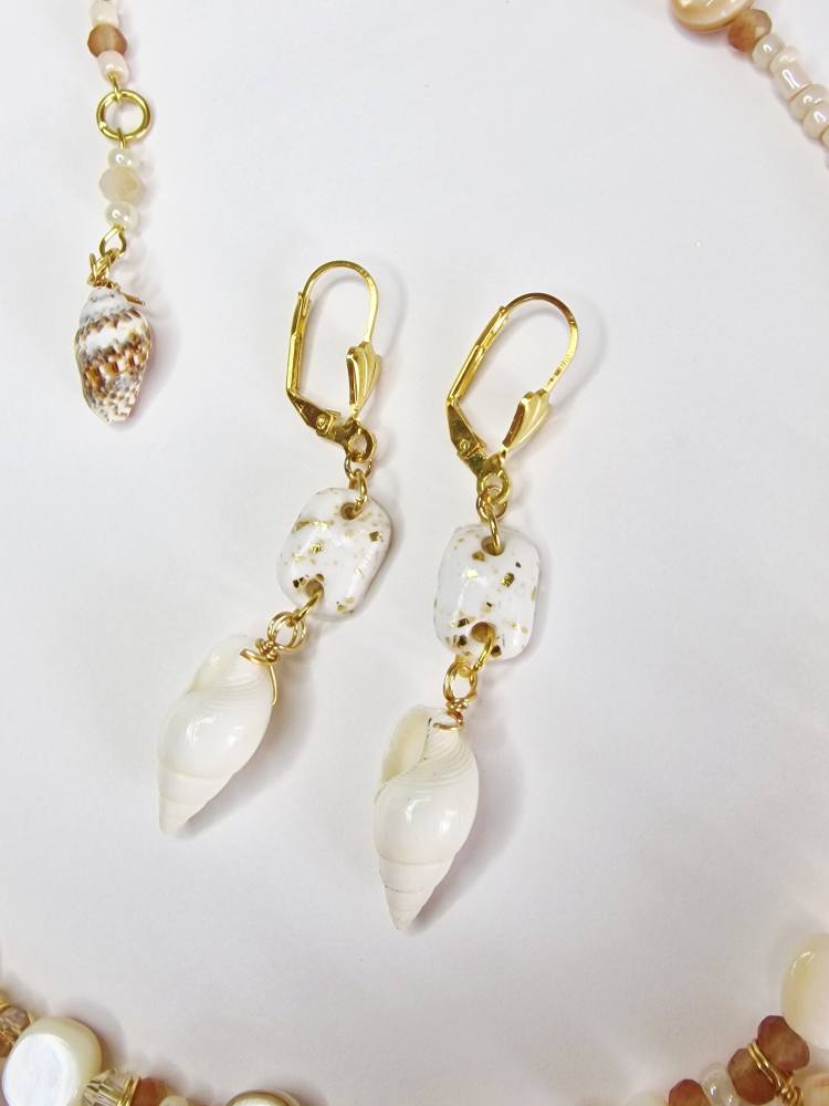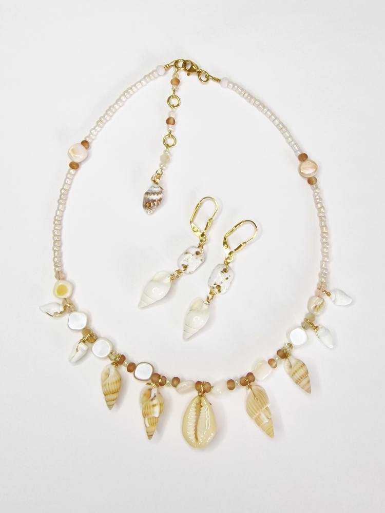 Parure unique. Composée d'un collier de perles de verre, nacre et coquillages. collier court ajustable. Avec une paire de boucles d'oreilles assorties. Montures en acier inoxydable. En résine perles et coquillages.