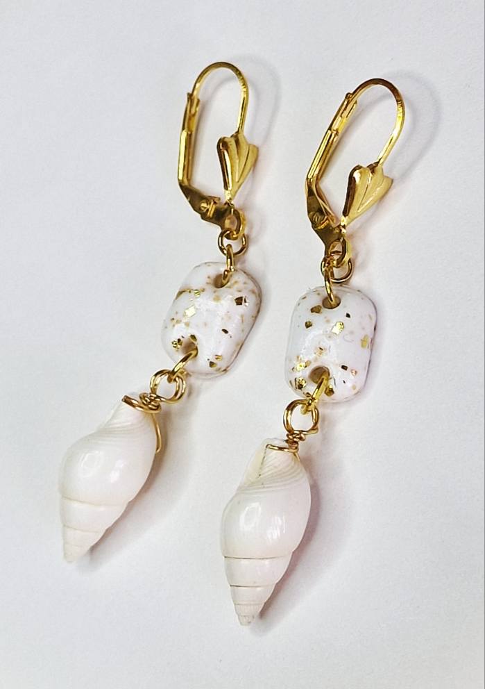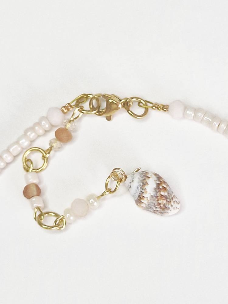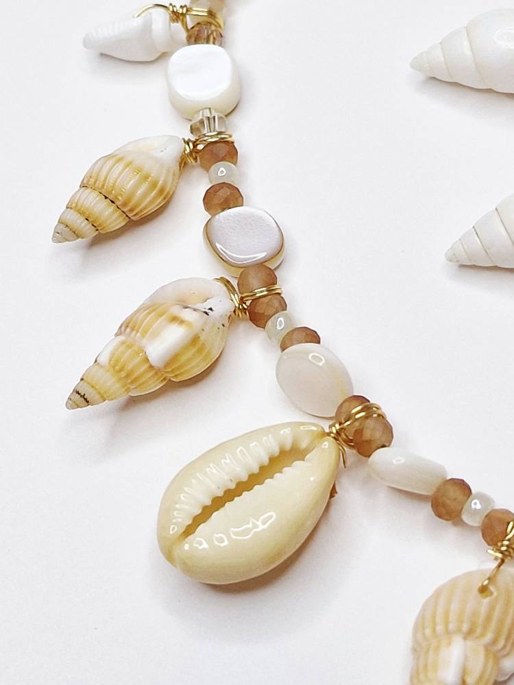 Parure unique. Composée d’un collier de perles de verre, nacre et coquillages. collier court ajustable. Avec une paire de boucles d’oreilles assorties. Montures en acier inoxydable. Résine perles et coquillages.