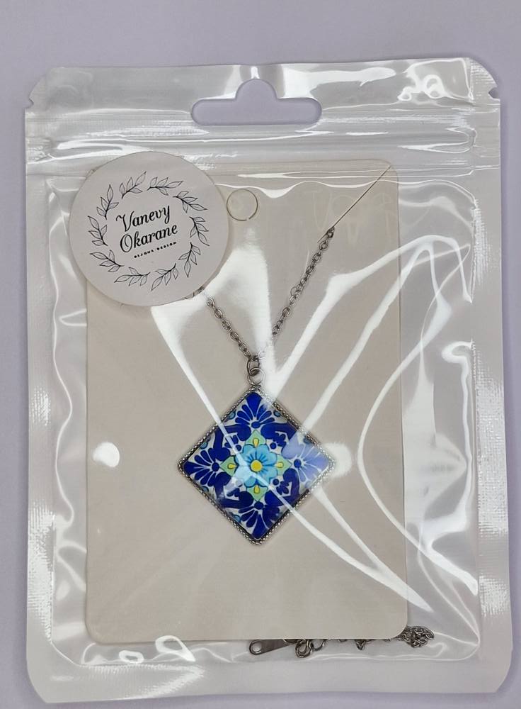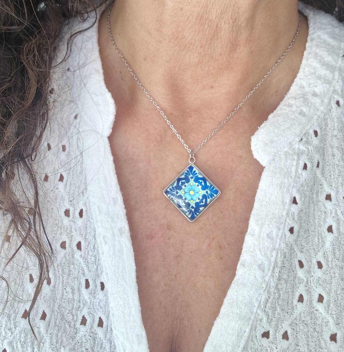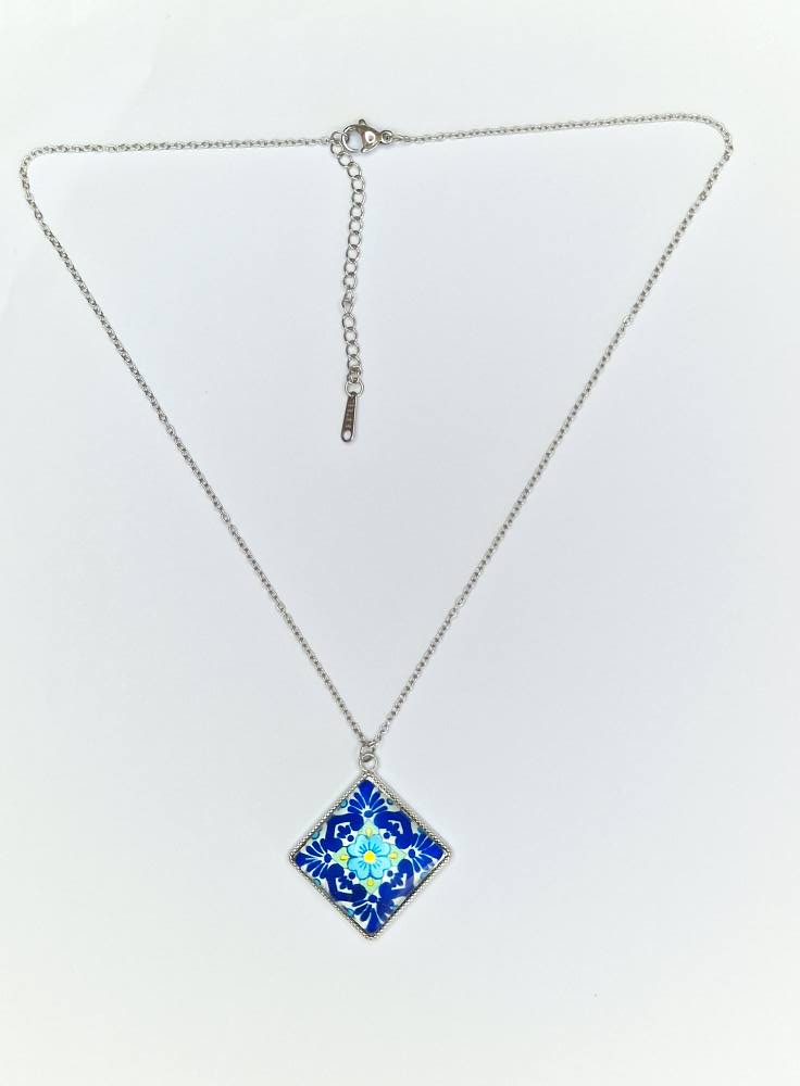 Pendentif et sa chaîne ajustable. Les motifs sont inspirés des céramiques italiennes. Bleu et rouge. Chaîne courte en acier inoxydable. Un peu de dolce Vita à porter. Bleu.