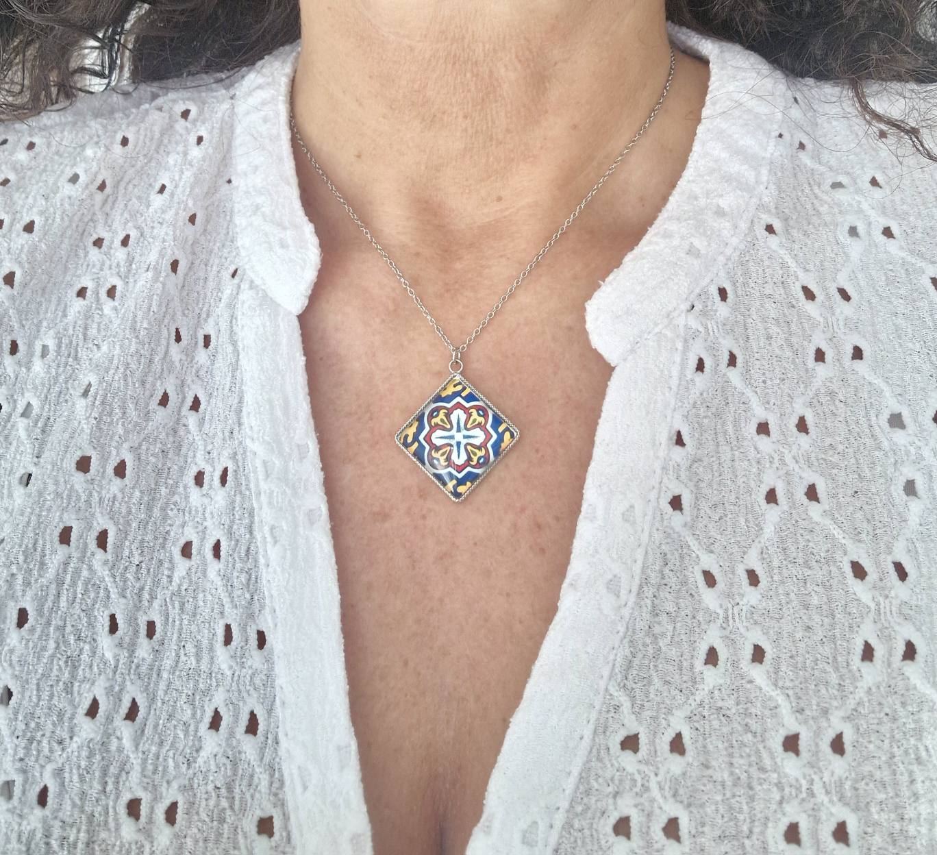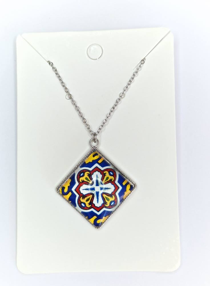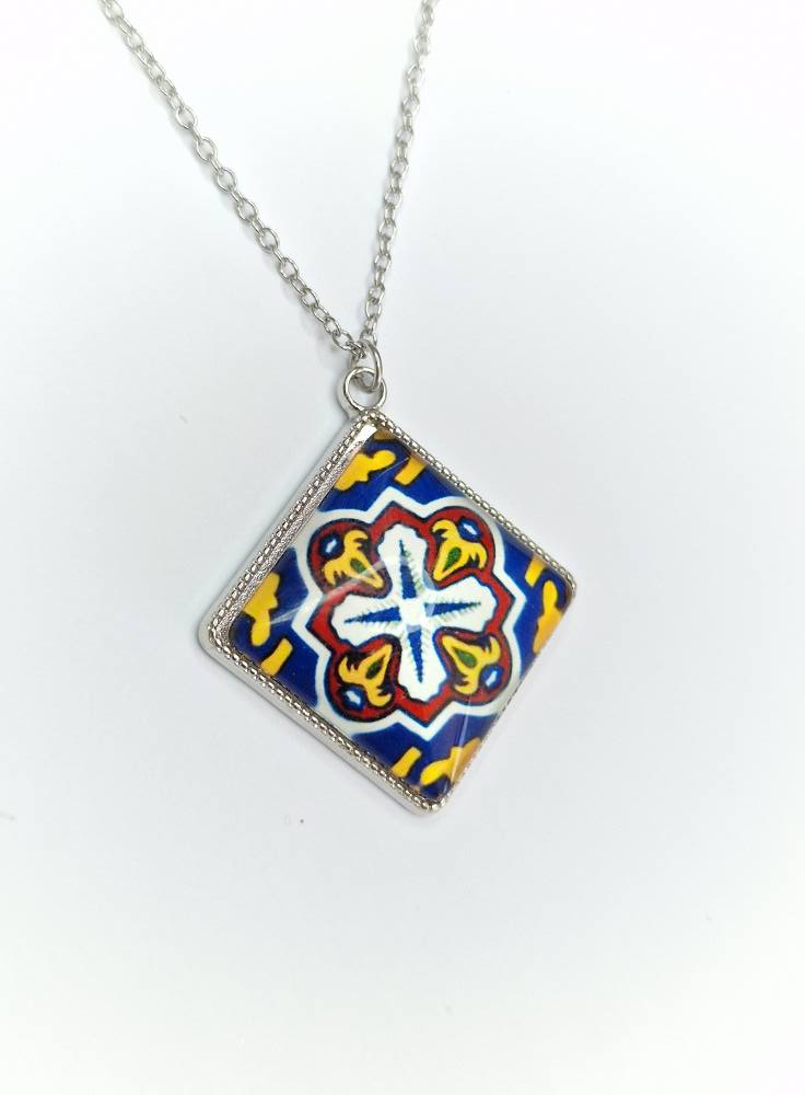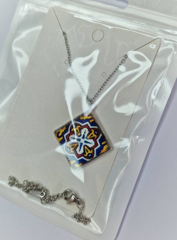 Pendentif et sa chaîne ajustable. Les motifs sont inspirés des céramiques italiennes. Bleu et rouge. Chaîne courte en acier inoxydable. Un peu de dolce Vita à porter.
