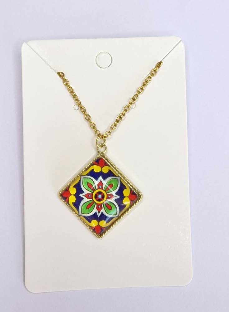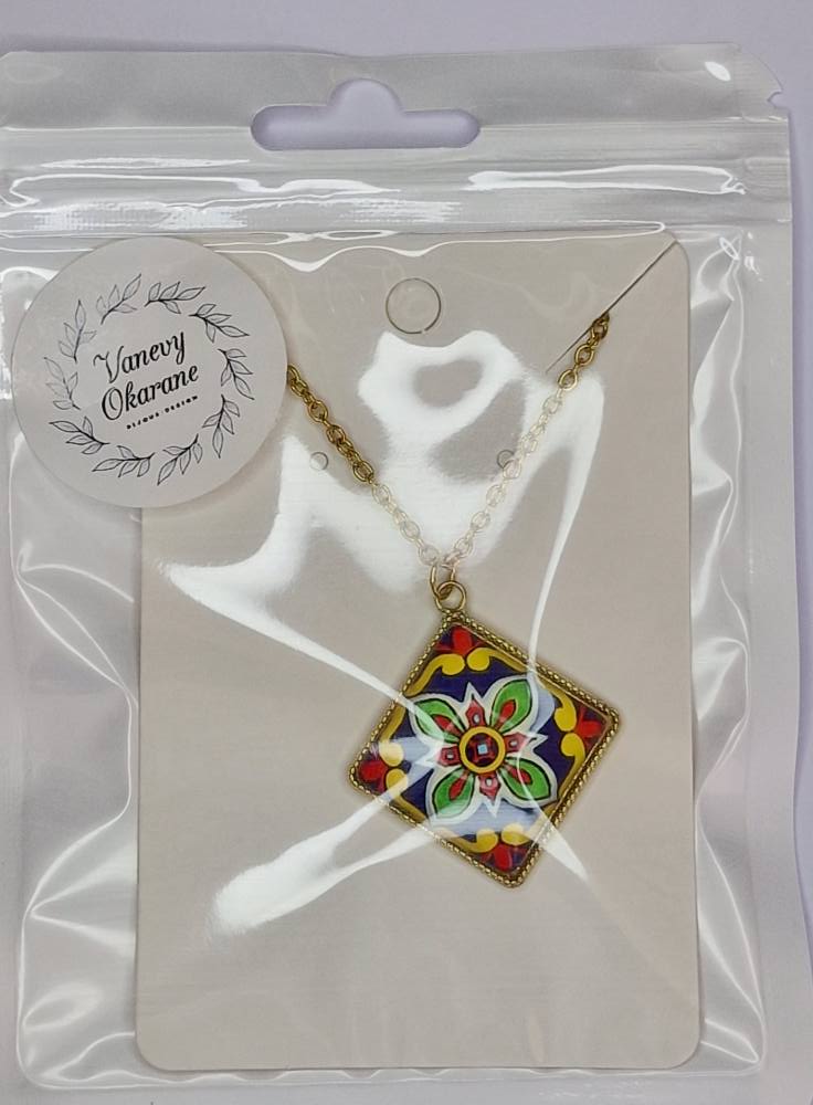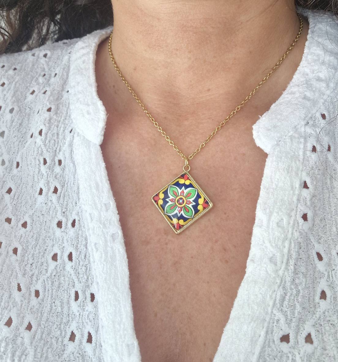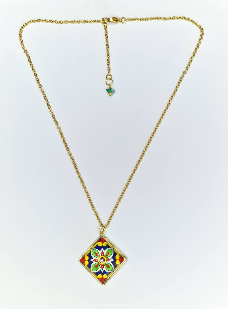 Pendentif cabochon carré. Les motifs sont inspirés des céramiques italienne. Chaîne en acier inoxydable. collier court ajustable. Un peu de dolce Vita à porter. Pendentif multicolore. Chaîne dorée.